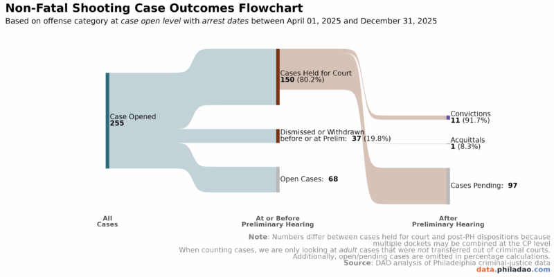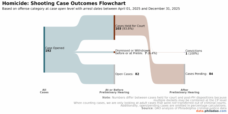 While our dashboard has included Case Outcome reports since 2019, the Case Outcomes Sankey and the IAC Sankey allows viewers to see the flow from incident to arrest to case initiation through case resolution – providing a fuller picture of the systemic response. The Case Outcomes Sankey shows the total number of cases opened for arrests that occurred between April 01, 2025, and December 31, 2025. It then highlights the Preliminary Hearing phase: the first determination of whether the prosecution has met the legal burden to proceed with the case (prima facie; showing that more likely than not, the defendant committed the crime in question). At this juncture, cases can either be held for court, dismissed or withdrawn, or are still awaiting a preliminary hearing (an “open case”). Cases that are held for court proceed through the court system, and the next phase shows the outcome of the case: whether the result was a conviction, withdrawal or dismissal, or a not guilty finding. For homicides and non-fatal shootings, the bulk of cases are pending an outcome due to how long these cases generally take to move through the system and resolve (see our Case Length report for more information).