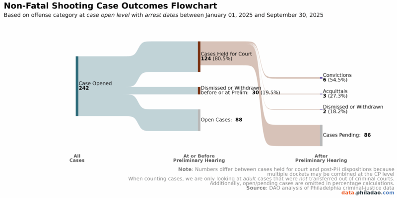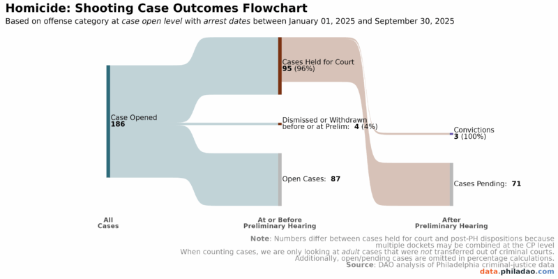 While our dashboard has included Case Outcome reports since 2019, the Case Outcomes Sankey and the IAC Sankey allows viewers to see the flow from incident to arrest to case initiation through case resolution – providing a fuller picture of the systemic response. The Case Outcomes Sankey shows the total number of cases opened for arrests that occurred between January 01, 2025, and September 30, 2025. It then highlights the Preliminary Hearing phase: the first determination of whether the prosecution has met the legal burden to proceed with the case (prima facie; showing that more likely than not, the defendant committed the crime in question). At this juncture, cases can either be held for court, dismissed or withdrawn, or are still awaiting a preliminary hearing (an “open case”). Cases that are held for court proceed through the court system, and the next phase shows the outcome of the case: whether the result was a conviction, withdrawal or dismissal, or a not guilty finding. For homicides and non-fatal shootings, the bulk of cases are pending an outcome due to how long these cases generally take to move through the system and resolve (see our Case Length report for more information).