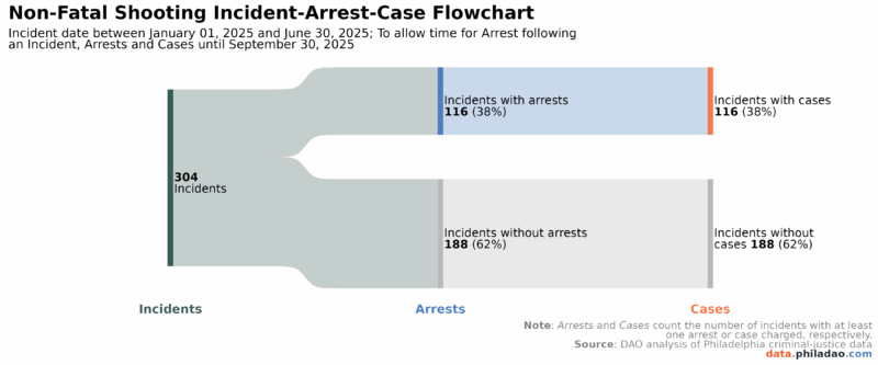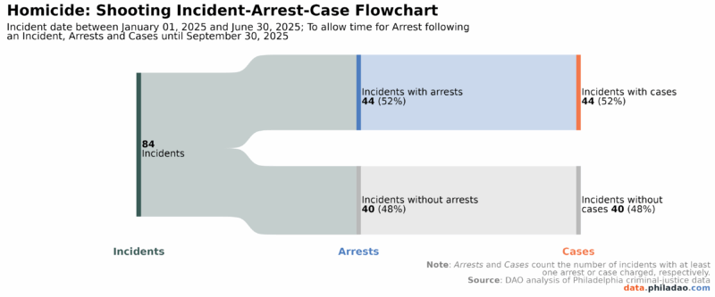 Generated by the District Attorney’s Transparency Analytics (DATA) Lab, the Incident-Arrest-Case Sankey, or IAC Sankey, starts by showing the number of crime incidents between January 01, 2025, to June 30, 2025. Incidents can either be reported by the public (e.g., by calling 9-1-1) or observed by law enforcement. The graphs then show the number of incidents that resulted in arrests made by Philadelphia Police Department (PPD) or other law enforcement (e.g., SEPTA, university police), and then with cases opened by the District Attorney’s Office (DAO) from that six-month period up to and including September 30, 2025. We include the 3-month lag to allow time for incidents that occurred later in the period to be resolved, e.g., by arrest.